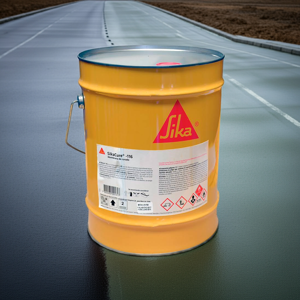 SikaCure-116 es un compuesto de curado para las obras en general y especialmente losas y pavimentos de hormigón, basado en resinas sintéticas polimerizadas disueltas en una mezcla de solventes alifáticos y aromáticos.