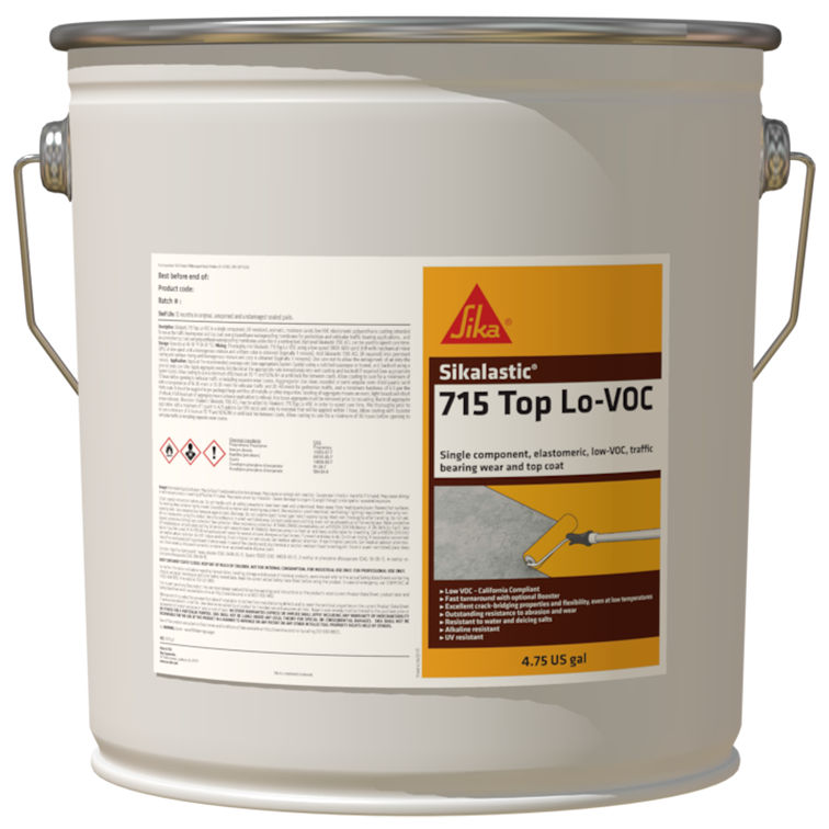 Sikalastic ®-715 Textured TopCoat es un revestimiento de poliuretano elastomérico, aromático, resistente a los rayos ultravioletas y a los rayos UV, destinado a usarse como desgaste y protección en revestimientos de tránsitosobre la membrana impermeabilizante de poliuretano para aplicaciones en tráfico peatonal y vehicular.